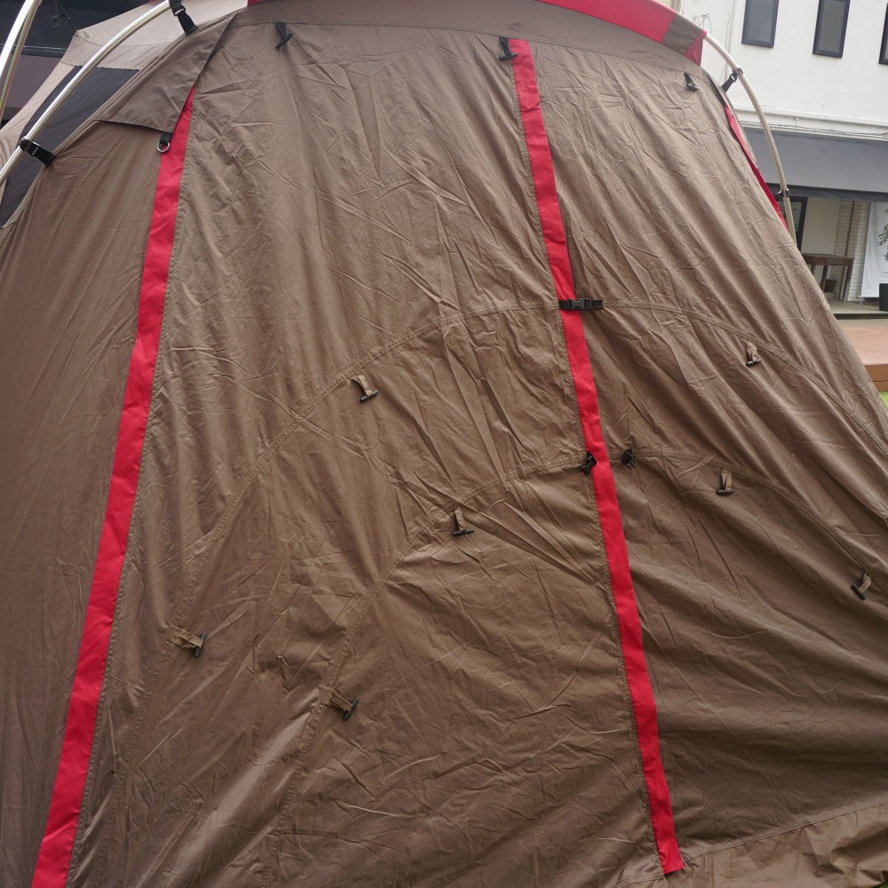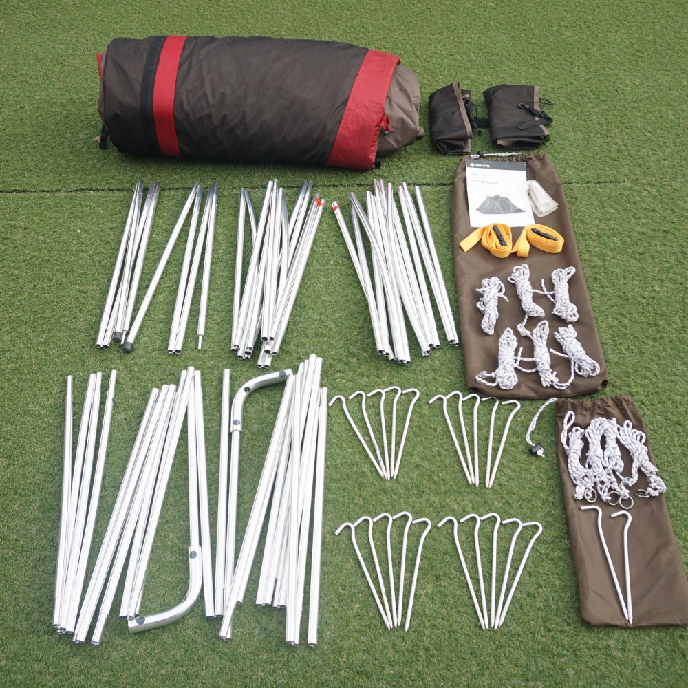 付属品 | 収納ケース アップライトポール2本、三角ポケット2個、説明書、シームグリップ剤、コンプレッションベルト2本、自在付ロープ10本(3.5m×6/Oリング付2m×4)、フレームケース、ペグケース、ジュラルミンペグ22本 |