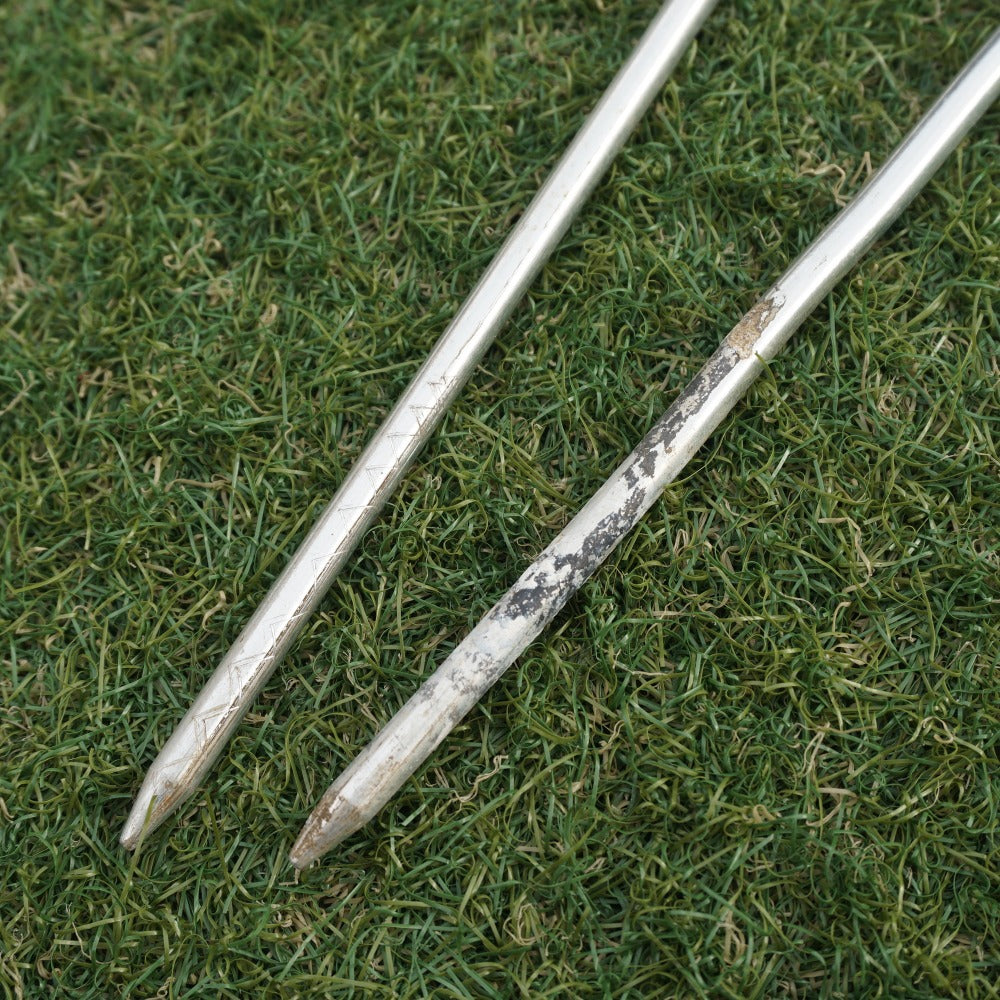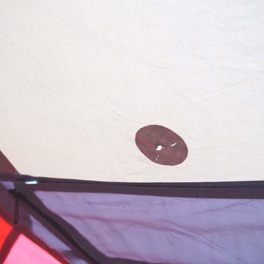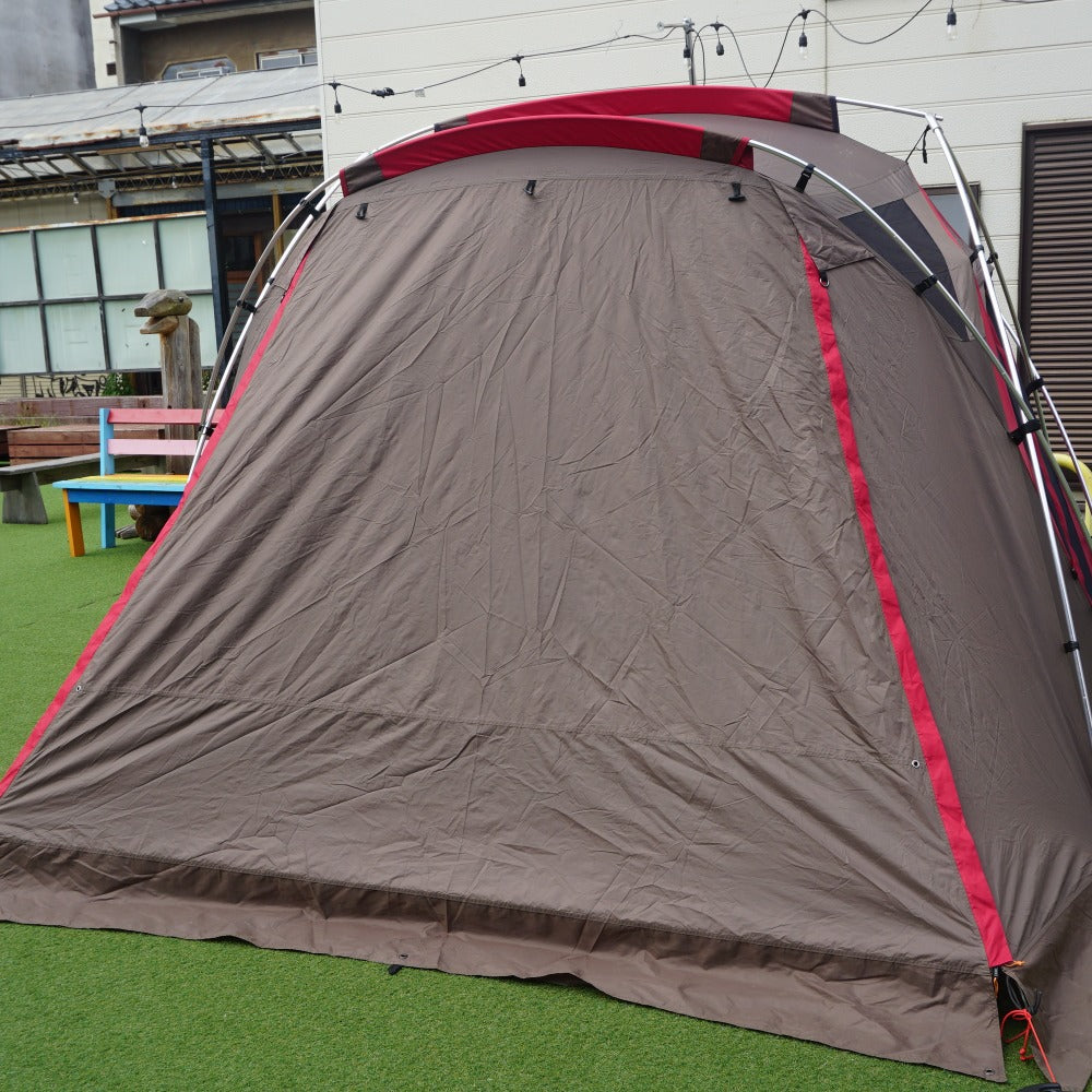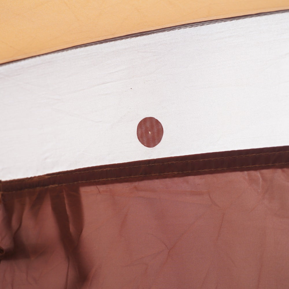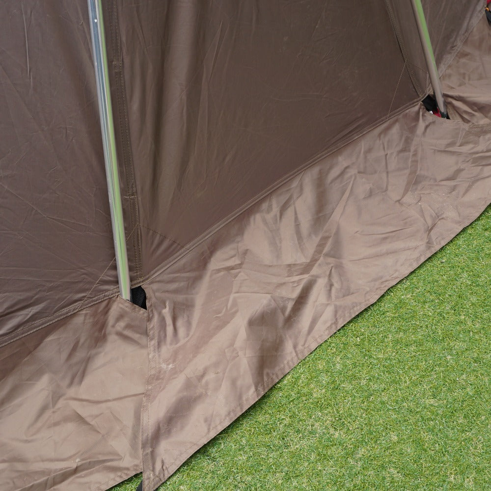 側面の天井部付近に二か所、補修跡があります。 その他貫通穴ではないですが使用に伴う傷も複数見られます。 また、スカート部分に薄い土汚れと数か所、数ミリほどの穴がありますが、 フレームの変形などはなく、当店にて設営も確認できました。 |
