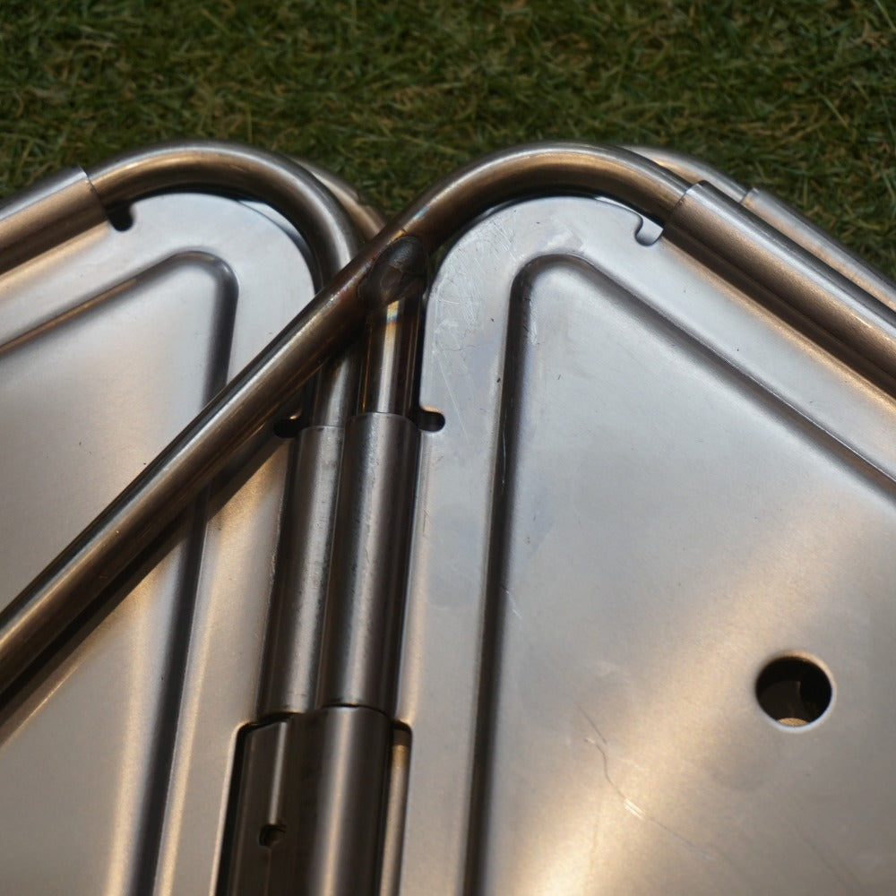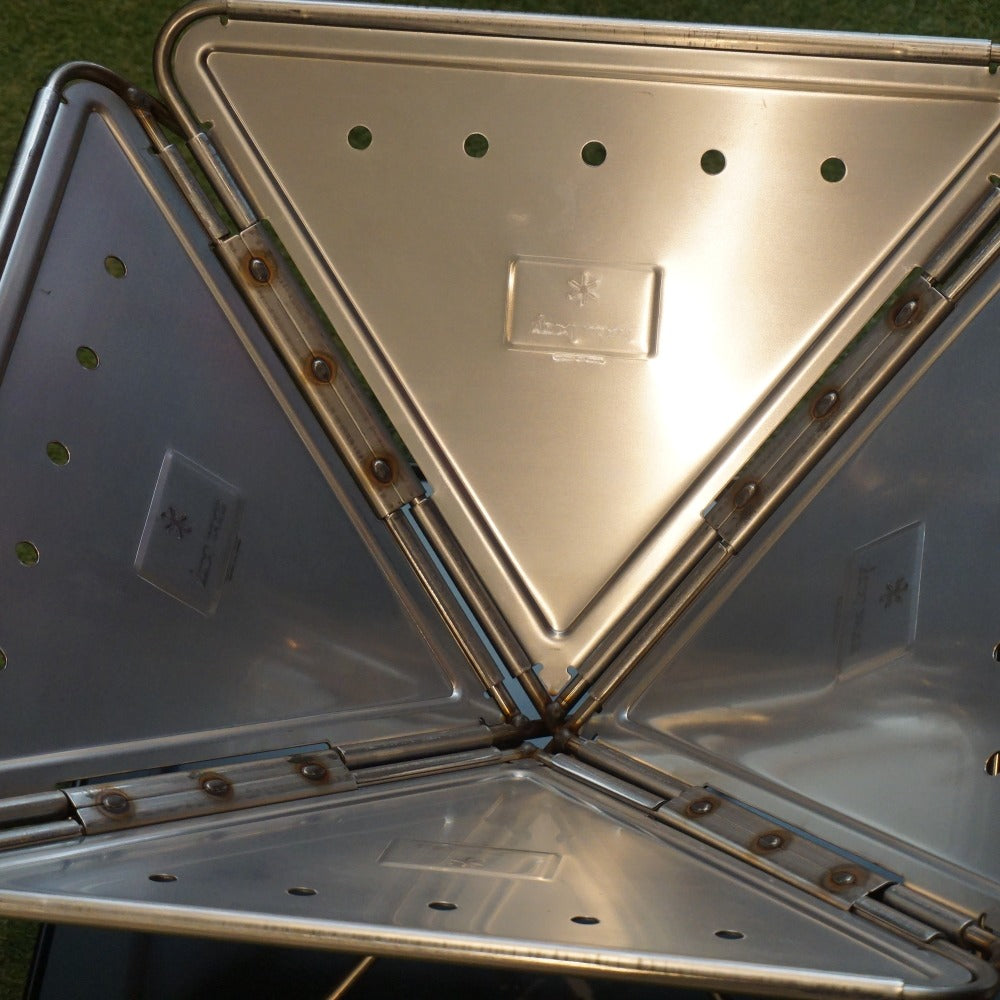 ベースプレートに、保管時についた、ひび割れのような線キズは2箇所ございますが、 表面のみで、割れてはおりませんので、ご安心ください。 焚火台本体は、ごくわずかに線キズなどございますが、 目立った汚れなど使用感はなく、状態は非常に良好です。 |