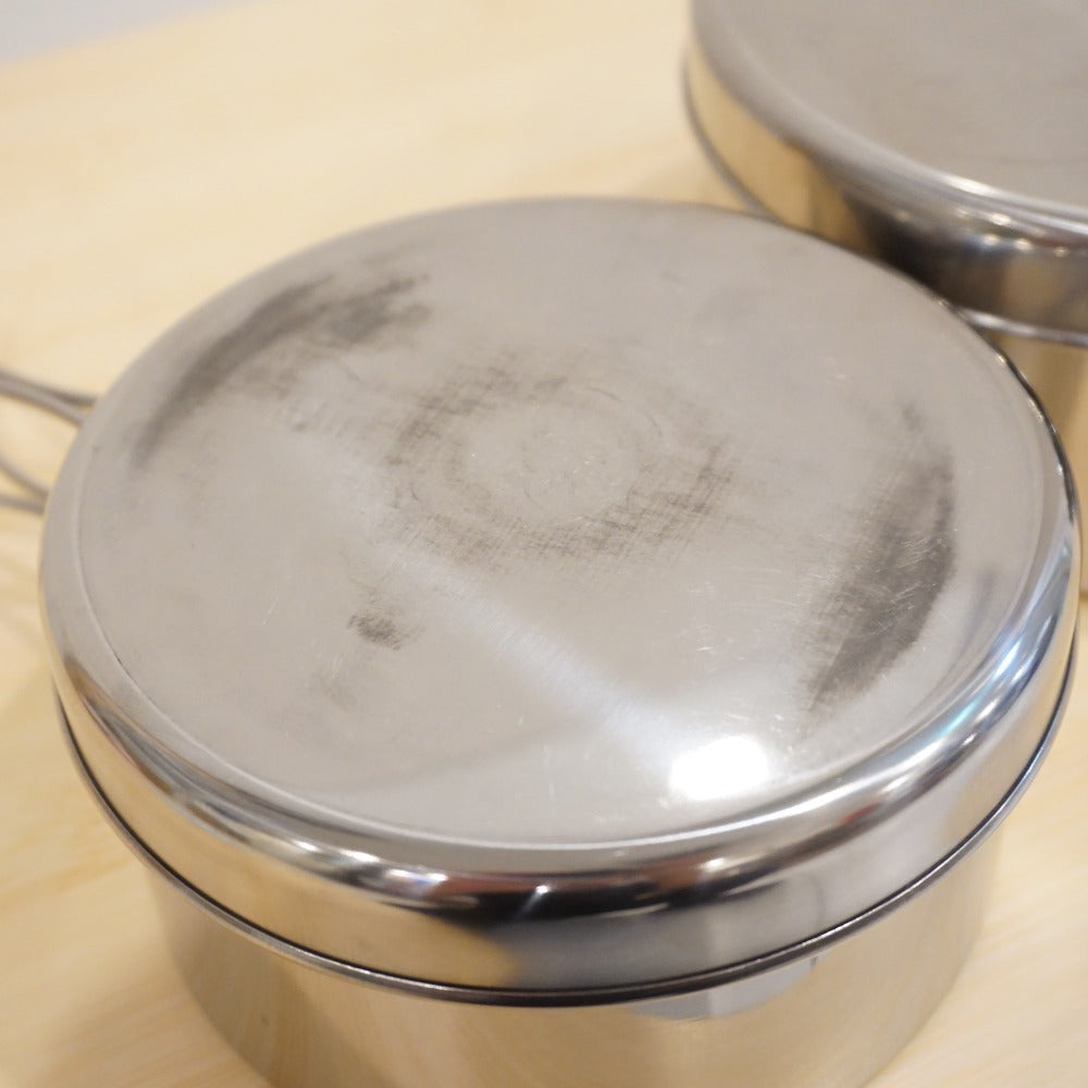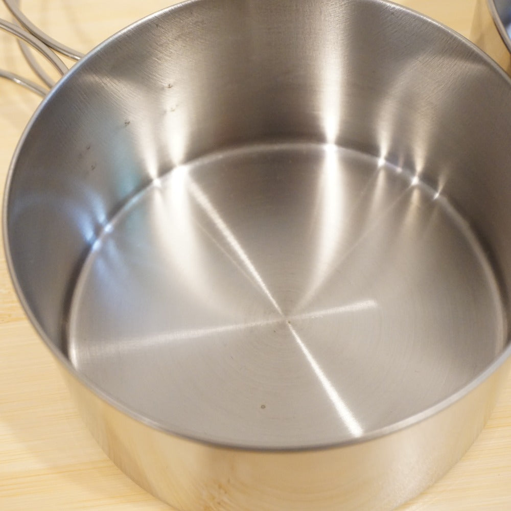 13㎝皿外側の底面に使用による細かなキズと薄い汚れがあり、 15cm鍋内側の底面に、細かなキズはございますが その他目立った汚れなどはございません。 |