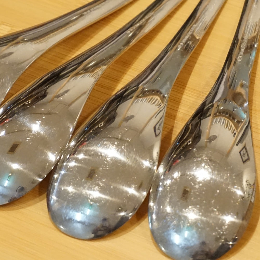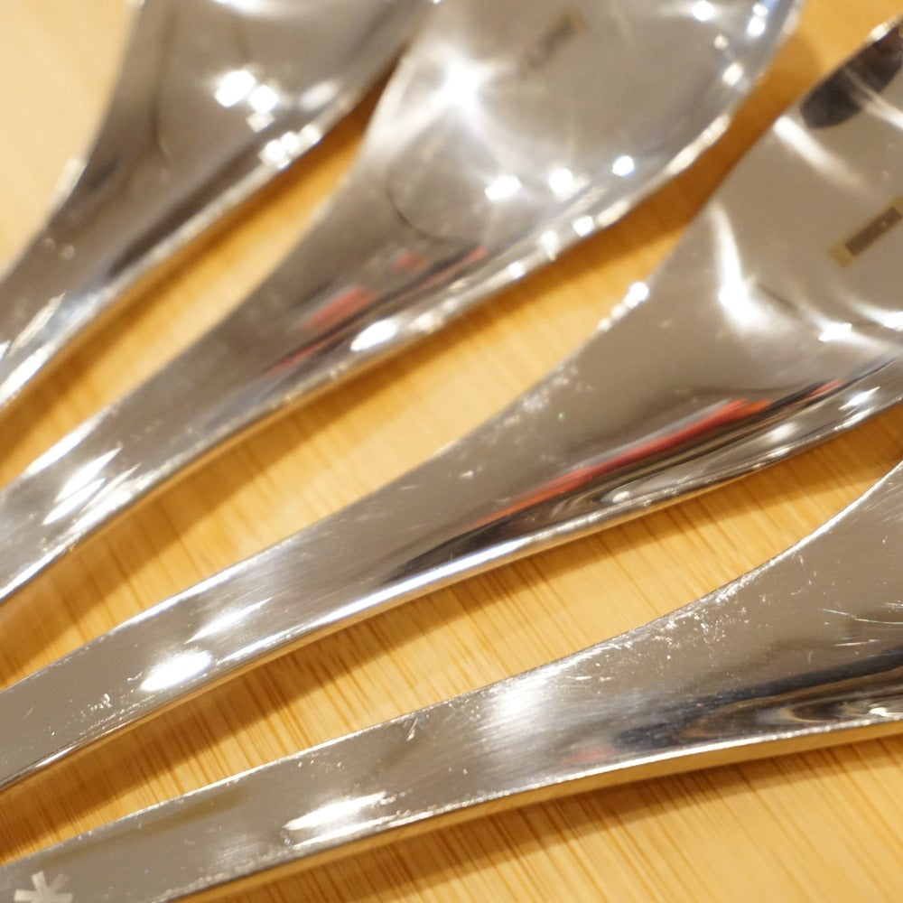 1本、ロゴ部分が薄くなっているものがあり、 全体的に細かな傷など使用感はございますが、 目立った汚れやスプーンの変形などはございません。 |