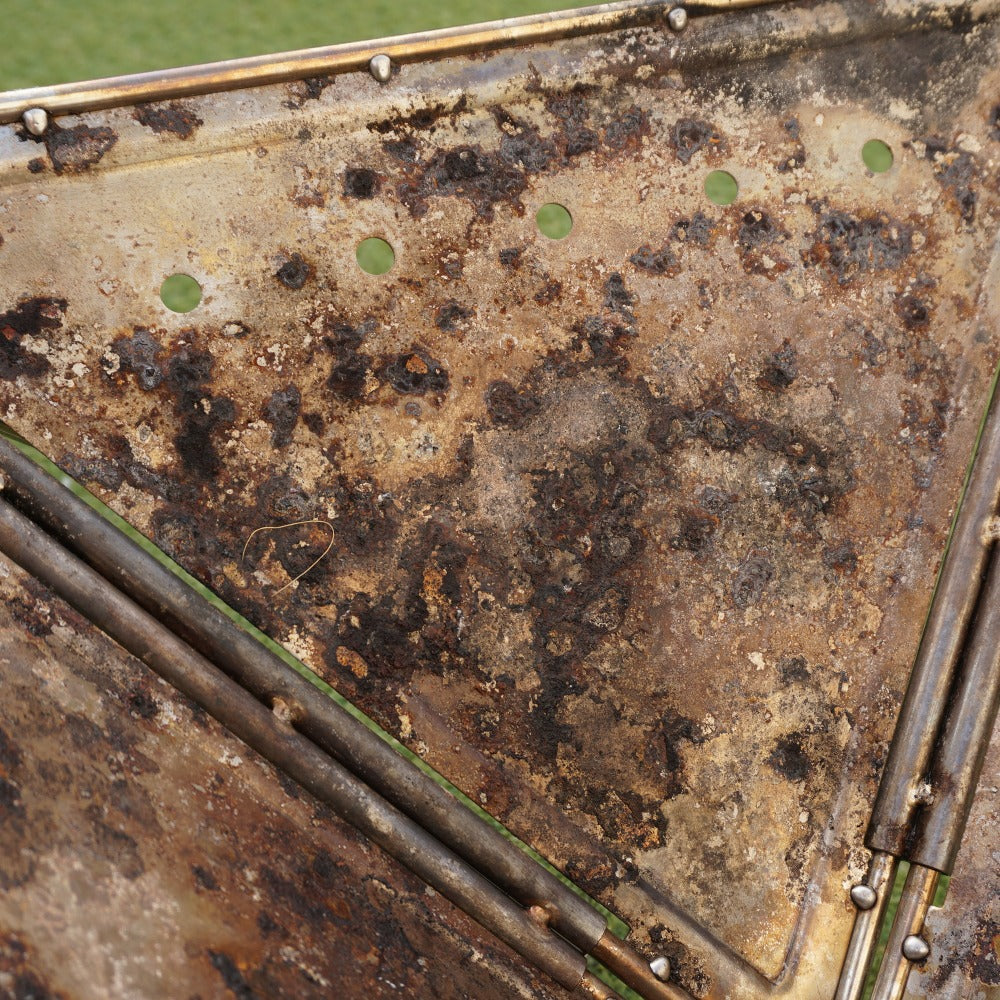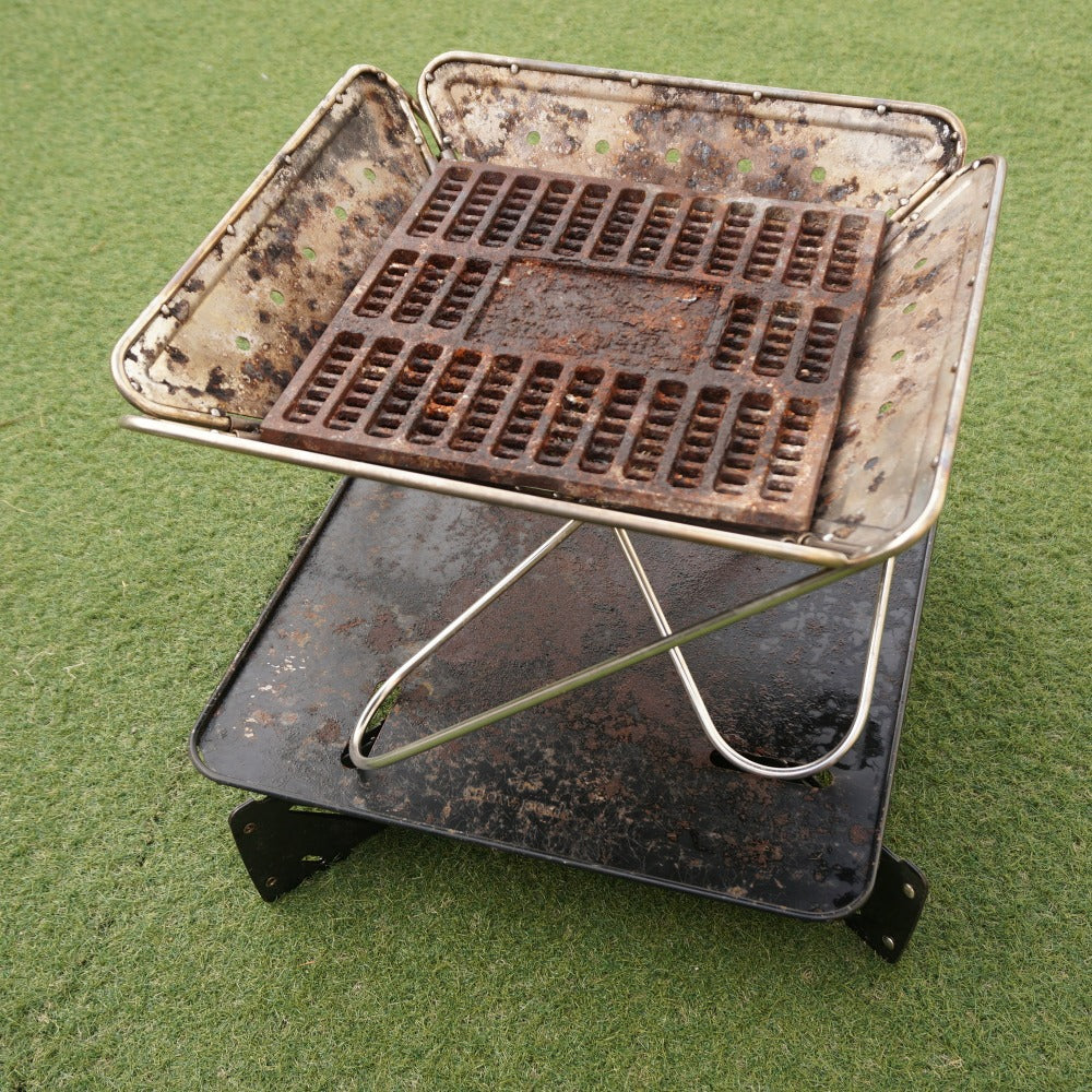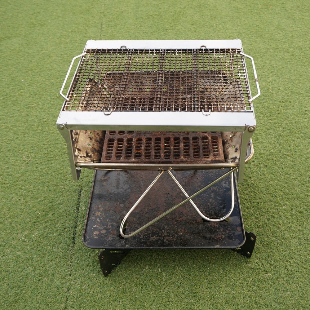 グリルブリッジとコンプリート収納ケースを除き、 全体的に使用や長期保管による錆や焦げなどが見られます。 特にベースプレートと焼アミは状態があまりよくありません。 |