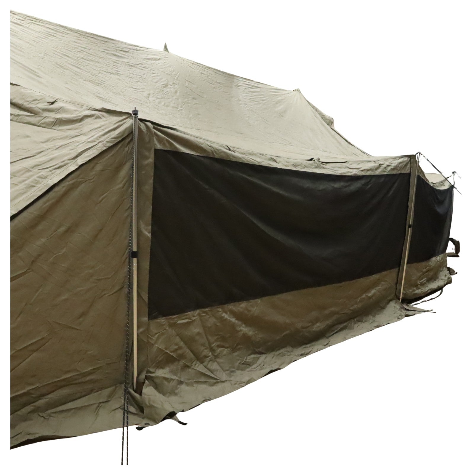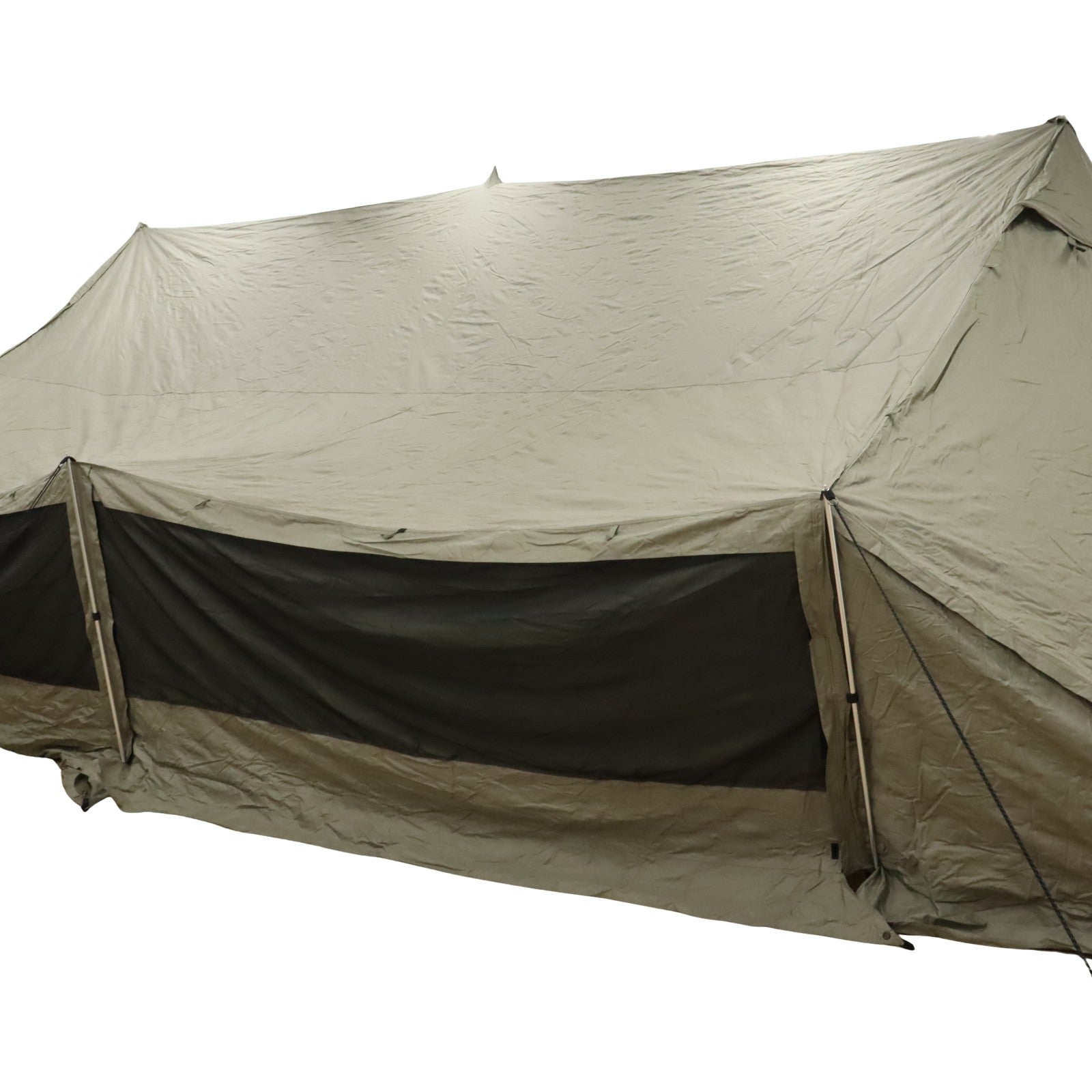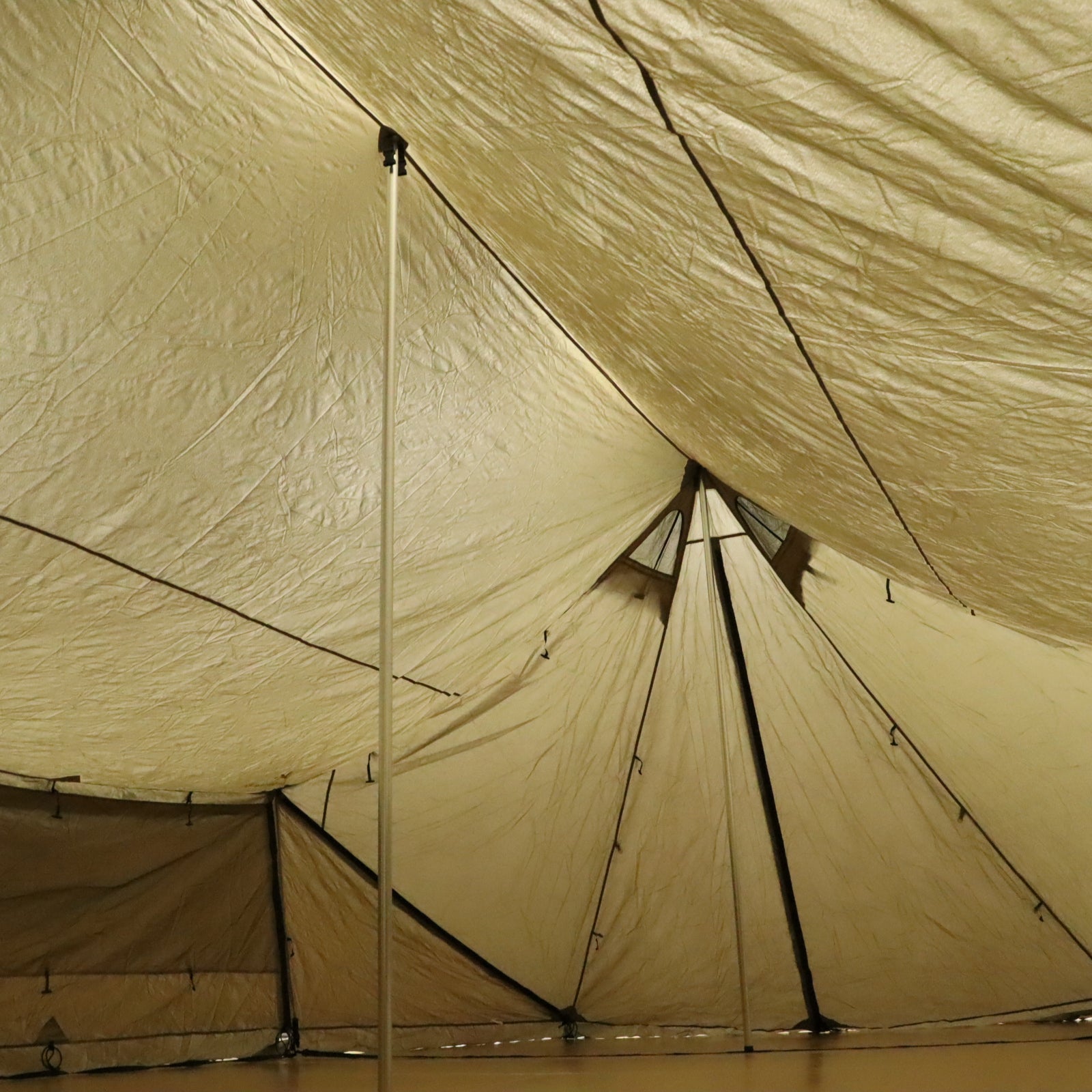 前後パネルやサイドウォールを巻き上げればオープンタープのような開放感のあるリビングスペースを作ることができます。本体生地にはコットンの質感のようなテカリのない風合いと質感を持つポリエステル生地を新たに採用しています。