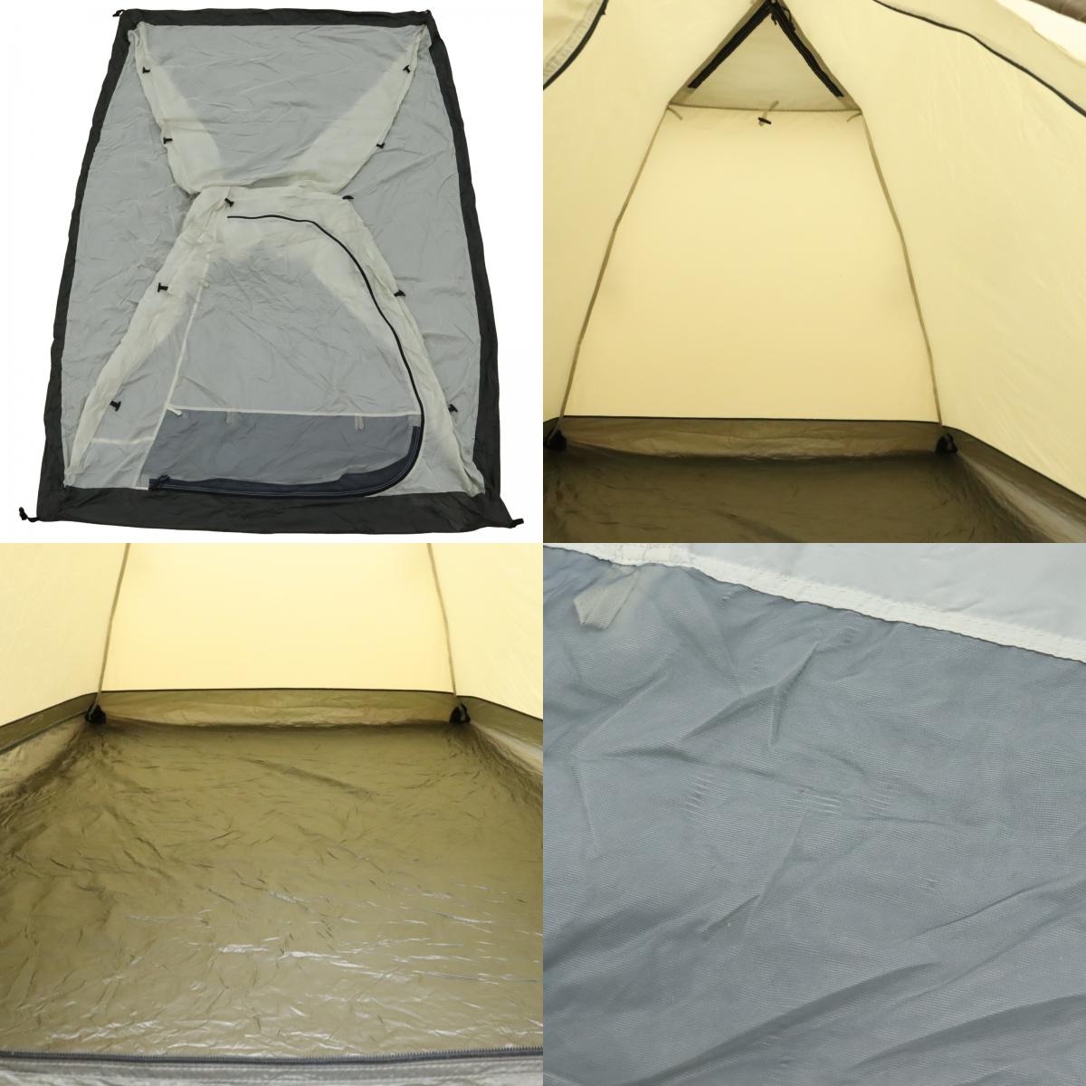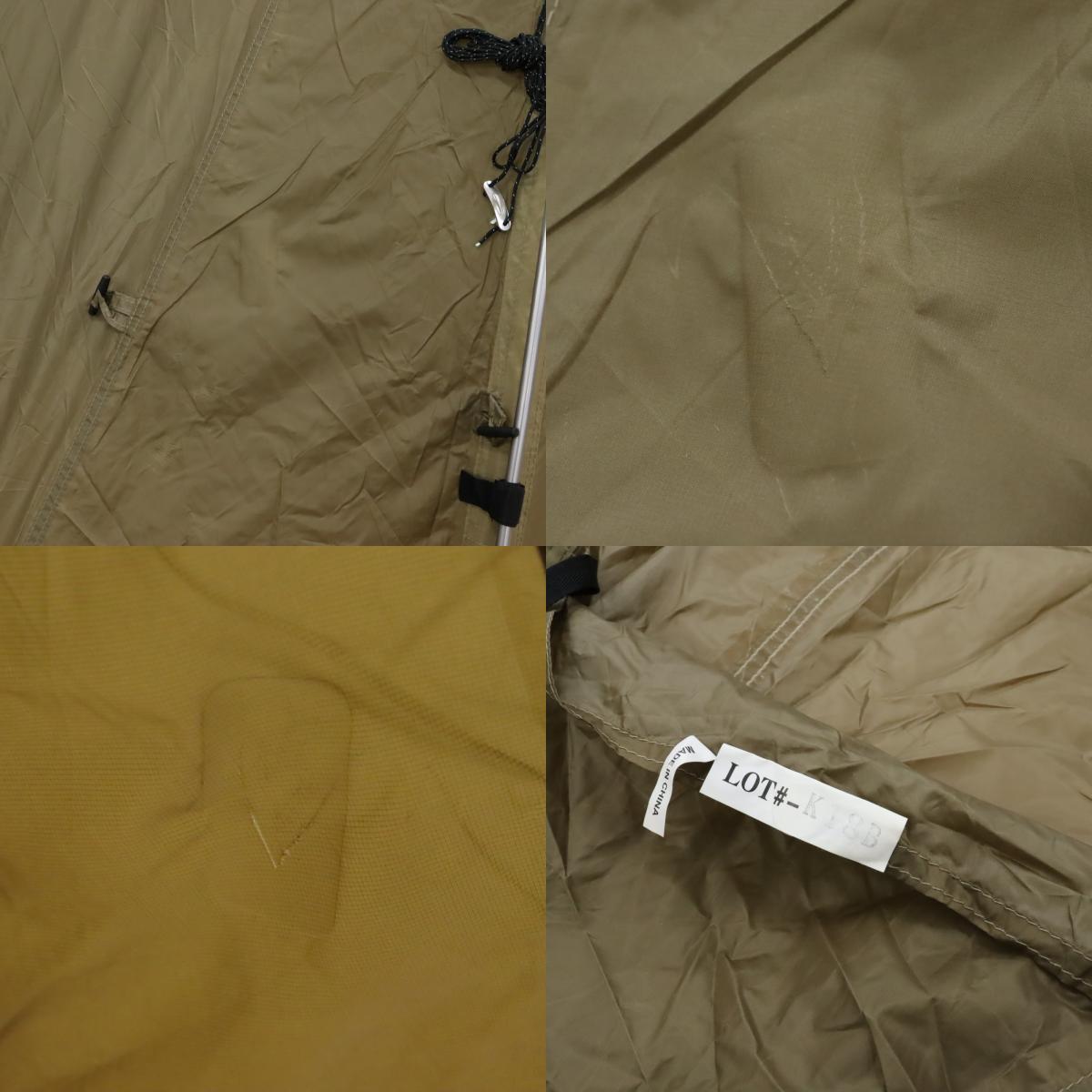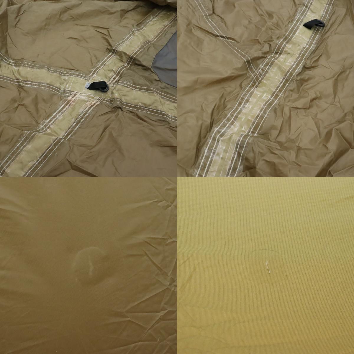 使用感がございます。 シームテープ:浮きあり、浮きあり 補修跡:2~4ヶ所所、2~4ヶ所所 フライシートのフロントドア付近に一カ所、左側面の下部に一カ所の補修跡がございます。 インナーウォールの接地面に軽度の土汚れがございます。 設営確認済です。 |