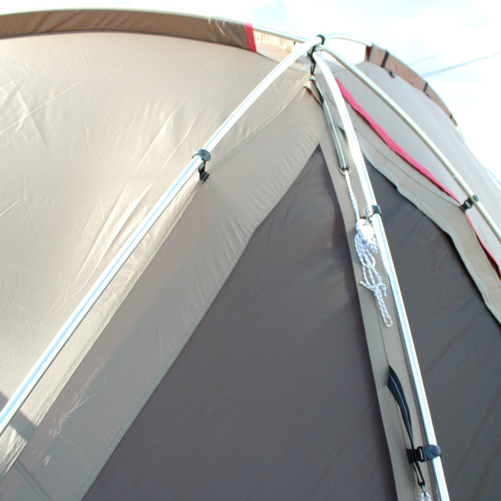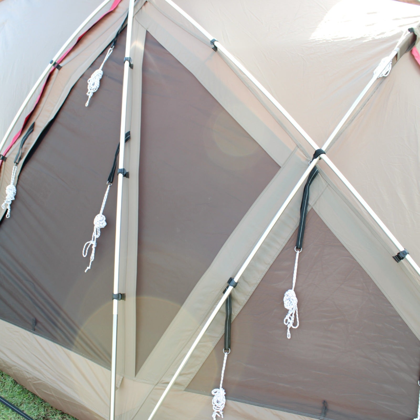 | 仕様 | 材質:本体ルーフ部/150Dポリエステルオックス・PUコーティング・耐水圧1,800mmミニマム・テフロン撥水加工・UVカット加工 本体ウォール部/150Dポリエステルオックス 耐水圧1,800mmミニマム・テフロン撥水加工・UVカット加工、 ※メッシュパネル後ろの生地は耐水圧1,800mmは満たしておりませんが、使用には十分な耐水圧がございます。 シールドルーフ/75Dポリエステルタフタ・遮光ピグメントPUコーティング耐水圧3,000mmミニマム・テフロン撥水加工・UVカット加工 インナールーム (ウォール)/68Dポリエステルタフタ インナールーム (ボトム)/210Dポリエステルオックス・PUコーティング耐水圧1,800mmミニマム、 グランドシート/210Dポリエステルオックス、PUコーティング耐水圧1,800mmミニマム |